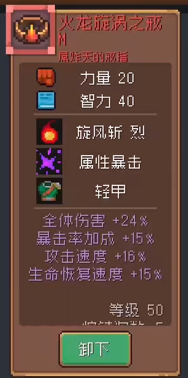 火龙旋涡之戒:这个戒指应该是最契合战士以及战士融合职业的饰品了,首先它在基础属性中有战士所需要的力量,羁绊方面,其独有的“旋风斩·烈”更是可以直接将战士技能中的“旋风斩”给转变为火焰属性的伤害,对于多数敌人来说,这类型的伤害将会显得更加具有威胁。