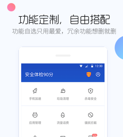 这是一个能够杀毒而且可免费使用的手机安全软件提供智能的扫描功能,还有快捷清理、加速清理的功能,在杀毒的时候主要就是通过6层环形防护的方式,让手机的每一个环节更加安全。