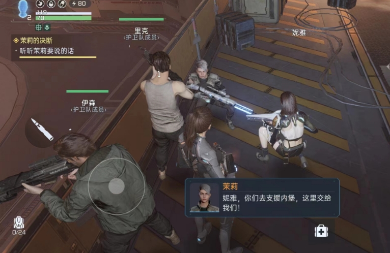 之后她把主角逮到了以茉莉为首的护卫队那边,他们一行正在对抗入侵者和他们的机甲,在妮雅的邀请下,主角与护卫队一起消灭了这些入侵者,之后踏上了支援内堡的旅程,后续经历完内堡一战后,主角算是正式开启了自己的幸存者生涯,同时妮雅也算是完成了她的新手导师任务,暂时与主角分别。