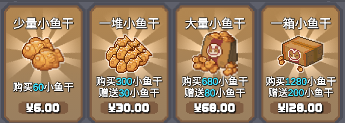 游戏商城中是只能购买小鱼干的,目前给大家准备了几种不同的充值套餐,最高上线是128元人民币,购买一箱小鱼干,可以获得1280个小鱼干,额外赠送给玩家们200个小鱼干;购买小鱼干后,大家就可以前往【秋梨服装店】了!