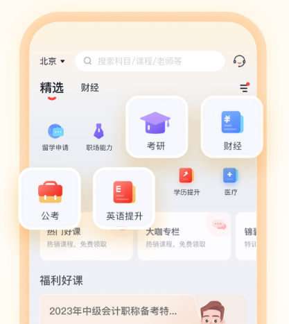 该软件主要可进行的学习主要针对的就是成人教育以及大学生教育里面的内容,也是包含这些年龄段的人的特点而设置的,比如有很多的数字产品以及有关于职业教育素质教育的内容,不管自己想要提高哪一个方面的成绩,都可在这里边搜索。有很多精选的内容,以及有关于财经的内容和考试等等,想要的学习内容应有尽有。
