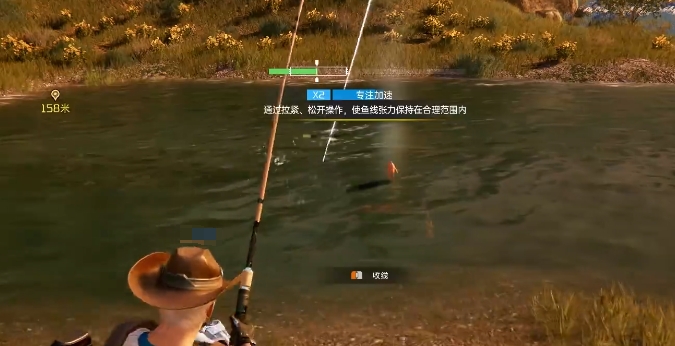 鱼竿制作好之后将鱼竿装备起来,虽然找到一个水边,点击钓鱼的选项就可以将鱼竿甩到水中,水中要是有鱼儿上钩的话,大家就可以看到上方的进度条,进度条会显示一个专注加速的效果,上面的进度条中也会有一个光标在不停的移动。