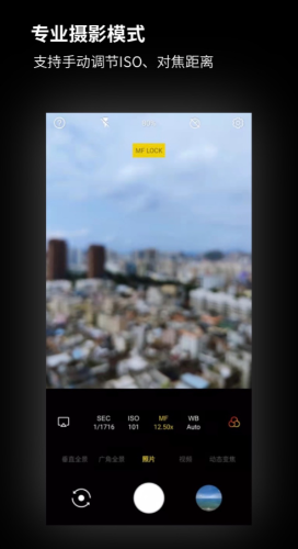 软件可以模拟出超高清的广角相机特效,在固定画幅内“塞上”更多的物品和要素。支持手动对曝光、感光度和焦距进行调节,成为很多专业选手的首选之一。