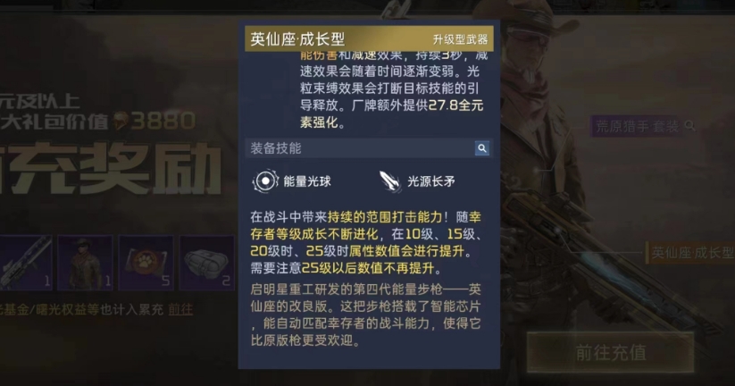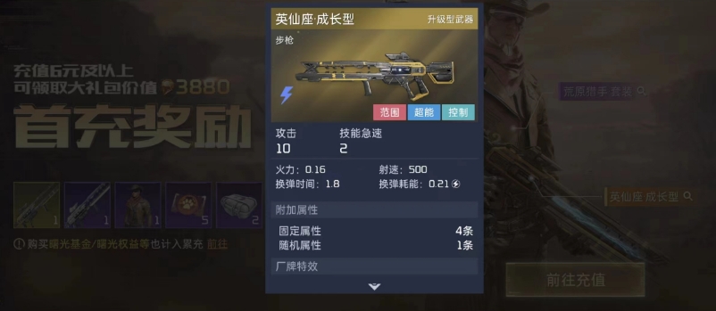 目前成长型武器主要都是指英仙座·成长型,这个武器它是首充六块礼包里领取的,其本身的品质有黄色,各项数值和技能也都看上去十分高端,但它通过镀层是没法直接升级的,不过其升级方法其实比镀层还要简单。