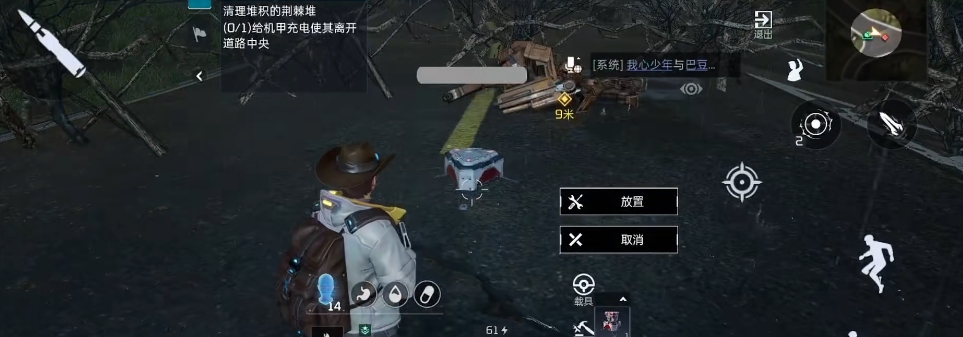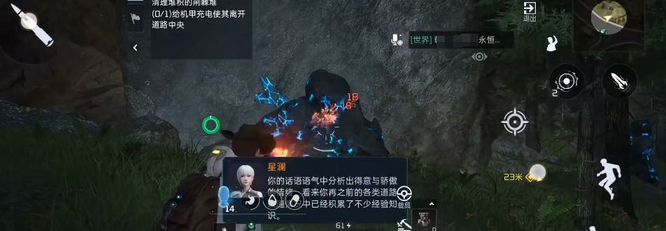 这个石头是非常好认的,在外观上面会有一层蓝色的电流覆盖,这个时候大家直接使用武器来将这块石头打碎就可以啦,打碎之后继续往前一点就可以根据指引来在指定的位置放道具,然后系统会给一个提示,根据这个提示的效果,大家往后面的小屋走。