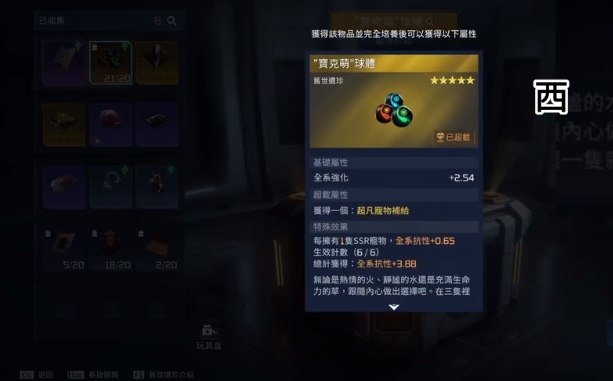 其实在里面宝克萌球体是属于一个为SSR等级的宠物带来加成的道具,在游戏中也属于是一个六星道具,大家在使用的时候其实在上面只要是拥有一个SSR级的宠物搭配这个球体就可以带来全系的抗性效果,而且还有机会可以获取宠物补给,所以效果是相当不错的。
