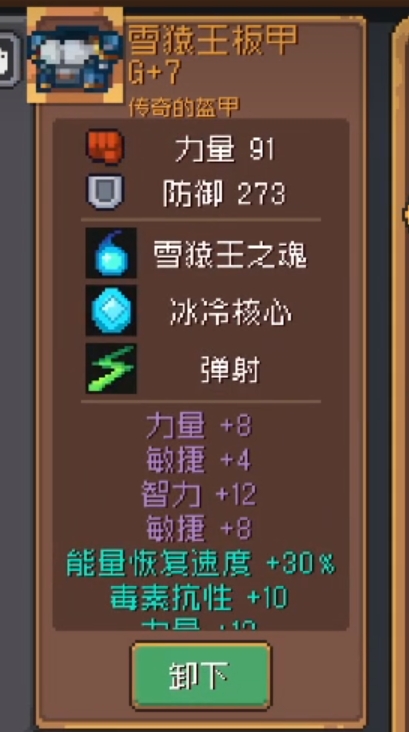 雪猿王板甲:boss套的传奇盔甲,50级G7强化能给到273的防御,也是适用于物理系职业的一个神级防具,三个羁绊分别加强冰冷伤害,冰冷抗性和投射物的制造能力。
