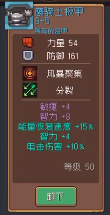 鹰骑士板甲:性价比极高的一件蓝色盔甲,50级G5强化的情况下有161的防御,不过它进攻属性加的是力量,所以推荐物理职业选用,其两个羁绊都是加强清怪效率的,实战效果不错。