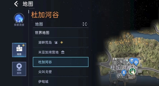 这个避难所它位于的地图区域是“杜加河谷”,因此要找到它,首先需要先点击右上角打开大地图,然后从世界地图中点进杜加河谷这里,一般来说,杜加河谷中第一个解锁的位置就是杜加避难所,所以可以直接一目了然的看见它。