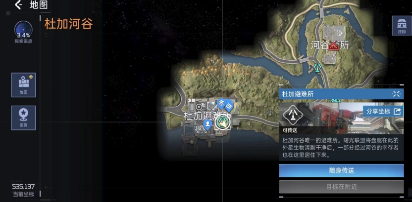 如果没看见的话,那么可以试试寻找该地图中(535,137)的坐标,这一坐标正好对应了该避难所中的远程终端,之前激活过的话那么就可以直接利用随身传送功能快速前往该处。