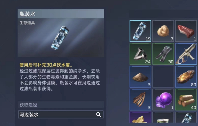 瓶装水小编一般都是带十个起步的,它的效果是每瓶饮用后补充30饮水度,想要获取的话就需要前往河边装水,但前提是你先拥有过滤瓶这一道具,毕竟游戏中大部分的水源都是有污染的,不过滤直接喝的话会有害健康。