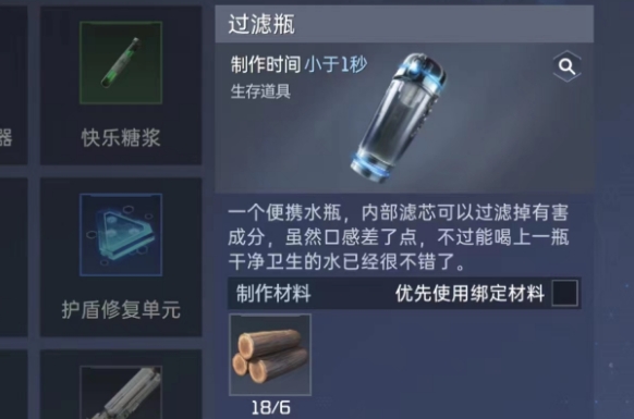 过滤瓶的获取也十分简单,只需要准备六个木材即可进行制作,制作完成后,找到一处河边,然后就会弹出喝水和装水两个选项,点击装水后,水就会被装进过滤瓶中,进入这个瓶子的水就会被过滤掉有害成分,也就是可以直接喝了。