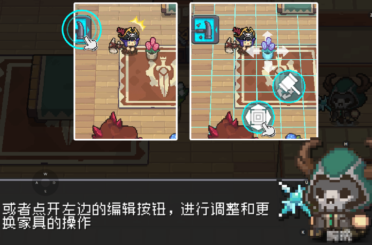 如果大家想更换家具的位置,那么就需要先点击左边的【锤子】图标,点击后,选中一个家具,在右下角有一个转盘一样的标志,点击后就可以更换位置和方向了!在游戏中玩家们还可以扩建这个地下室的面积!