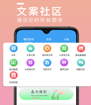 丰富的各种文案信息都在社区中等待大家获取,这款软件还能够直接生成九宫格、花样等多种类型的艺术文字,对于公众号运营来说是一款相当实用的工具。