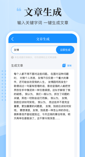 这款软件支持我们自己输入关键词来自动生成文案以及文章内容,而且还可以对字数、段落添加,这款工具操作十分便利,在生成完毕之后能够一键复制到其他软件中粘贴使用。