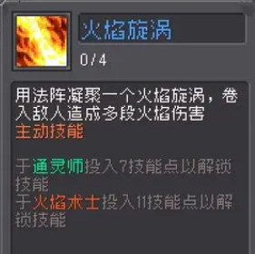 【火焰旋涡】:使用的技能点数同纵火术一样,可以在指定的位置召唤出一个火焰旋涡,附近的敌人会受到减速效果,被旋涡缓慢的拉进中心,同时敌人会受到多段火焰伤害!