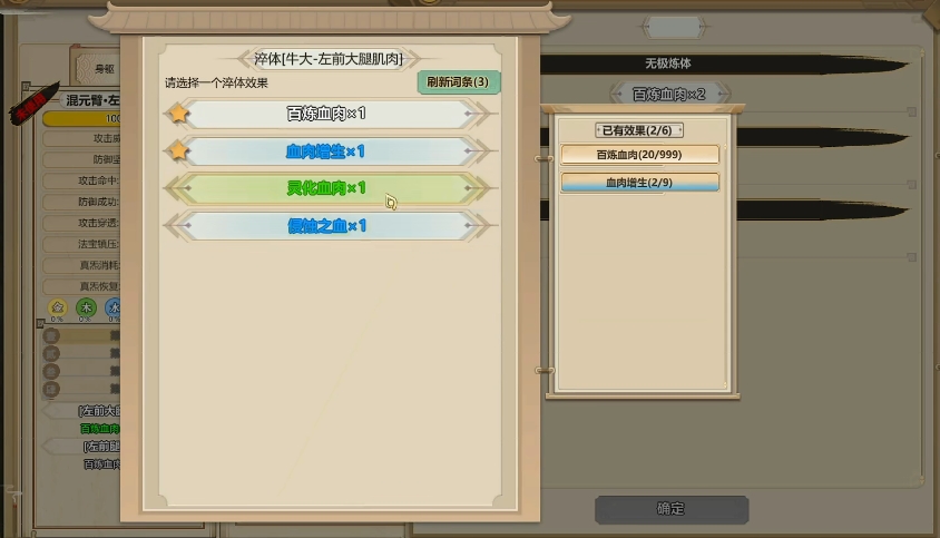 体修炼体的过程达到了这个时期之后大家就需要去查看前大腿的鸡肉啦,这个肌肉大家进行淬炼的时候很有可能会出新的词条,如果出的话大家选择元祖化或者是血肉增生就可以啦,而后腿肌肉在上面就需要大家用到风水灵机,这个精华在淬炼的过程中其实是比较挑场地的,如果不是大吉的房间很难出,如果大家淬体还没有到肠胃的话,其实通过吐纳也是可以出一部分的进化的。