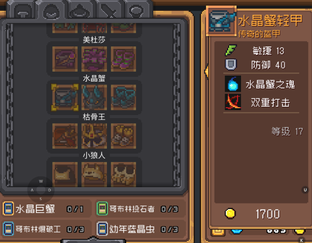 第二个就是武器的选择了,武器的选择其实还是比较多的,大家还是要在实战中去体验后,才可以进行搭配的,不过游戏中有一个套装,是大家在初期不挑职业的情况下,都是可以进行装备的,那么就是通过刷14等级的地图【水晶洞窟】来解锁水晶蟹装备,这个装备增加护甲和攻击值非常的不错,而且四种武器的羁绊效果,跟游戏中很多职业都非常的贴合,激活的【水晶蟹之魂】也是非常适合近战职业,而副系的【扩散】效果,可以增加攻击范围!