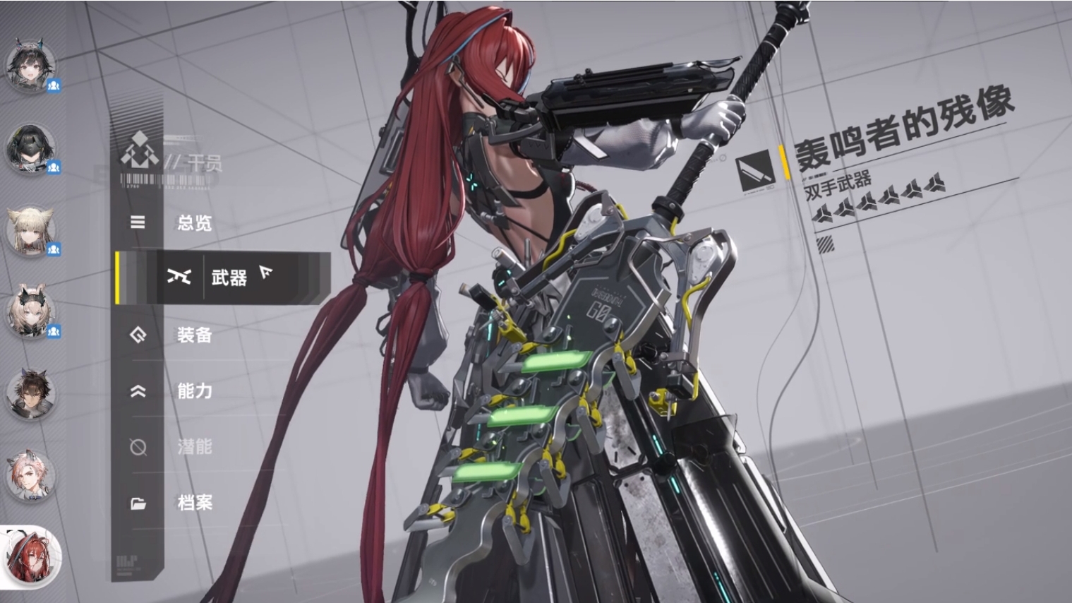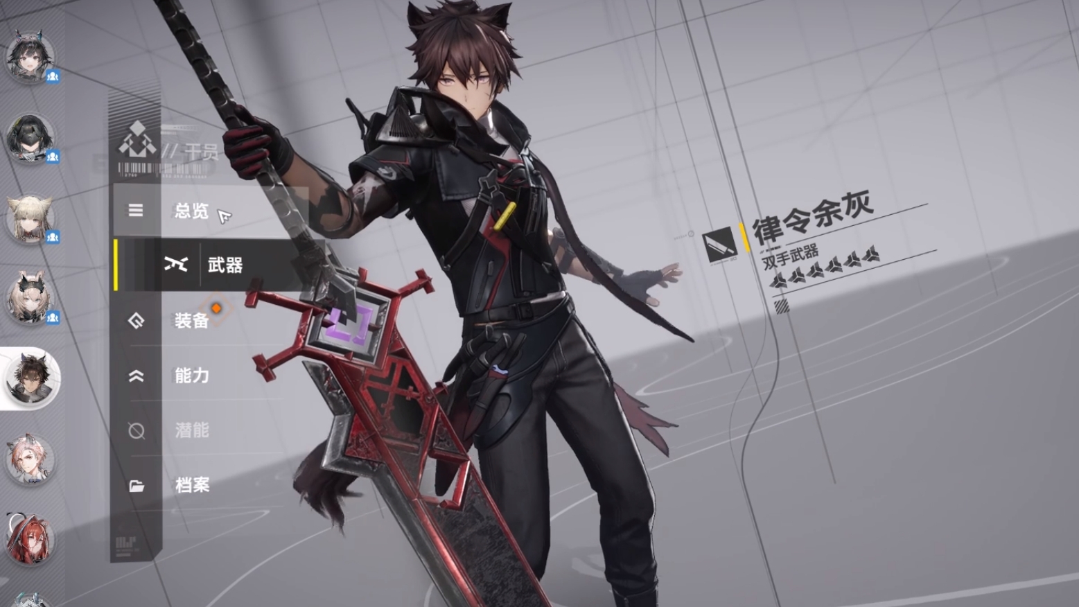 余烬在终末地中是使用双手武器(大剑)的角色,目前游戏里的两把六星大剑比较合适她。其中一把是轰鸣者的残像,它能让余烬在血线低于40%时获得暴击加35%、暴击伤害加70%的被动,并且持续时间16s,冷却时间也为16s,是一个能全程覆盖的buff技能,与余烬的定位较为的契合。