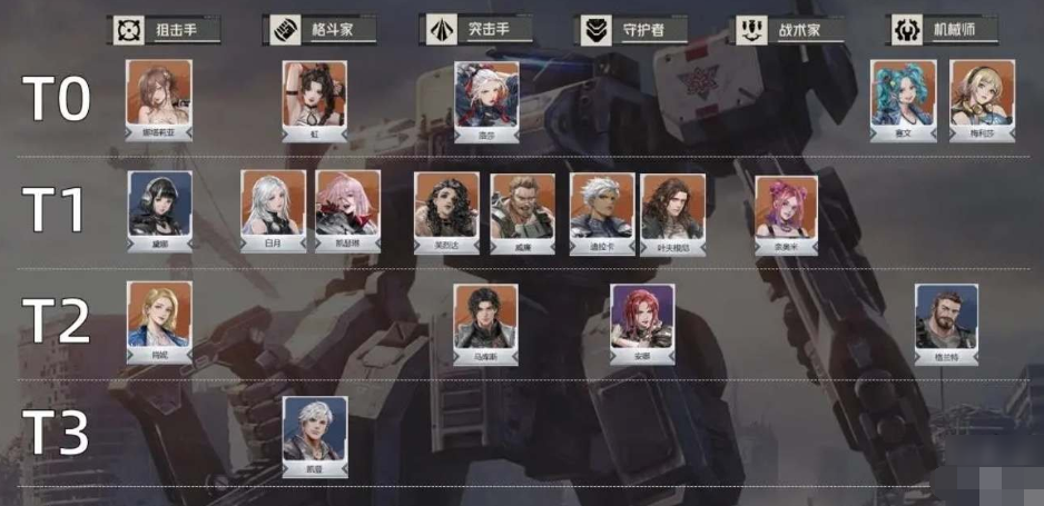 白月:白月是游戏中排行第一的角色,她是一个拥有强大火力和控制能力的机甲师。她的技能可以造成大量的范围伤害,同时也可以减少敌人的移动速度和攻击力。她的机甲是白月机甲,它可以提高白月的生存水平和输出能力,是一个非常全能的机甲。