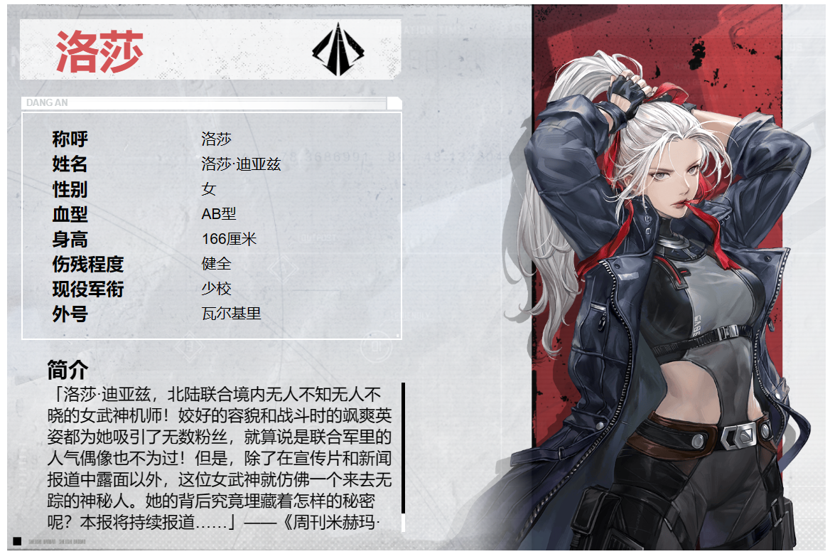 洛莎是游戏中排行第五的角色,他是一个拥有高爆发和护盾能力的法师。他的技能可以造成大量的魔法伤害,同时也可以为自己和队友生成护盾来抵挡敌人的攻击。他的机甲是洛莎机甲,它可以增加洛莎的魔法强度和魔法抗性。而且洛莎的技能机制非常爆炸,他能在单手机枪的主动反击结束后,被动触发作手武器的技能“追击”,虽说伤害倍率只有0.2倍,但是如果装备体系完整的话伤害也是十分爆炸的。