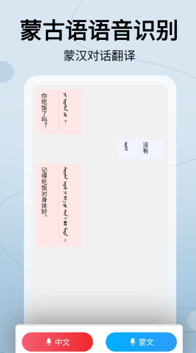 手机平台上很强大的蒙汉转化工具,能够快速对蒙古语进行识别并且转化为简体中文。不仅如此,这款软件还提供了语音识别即时转换以及拍照翻译的模式,能够适应更多的生活和工作场景需求,值得大家尝试一下。