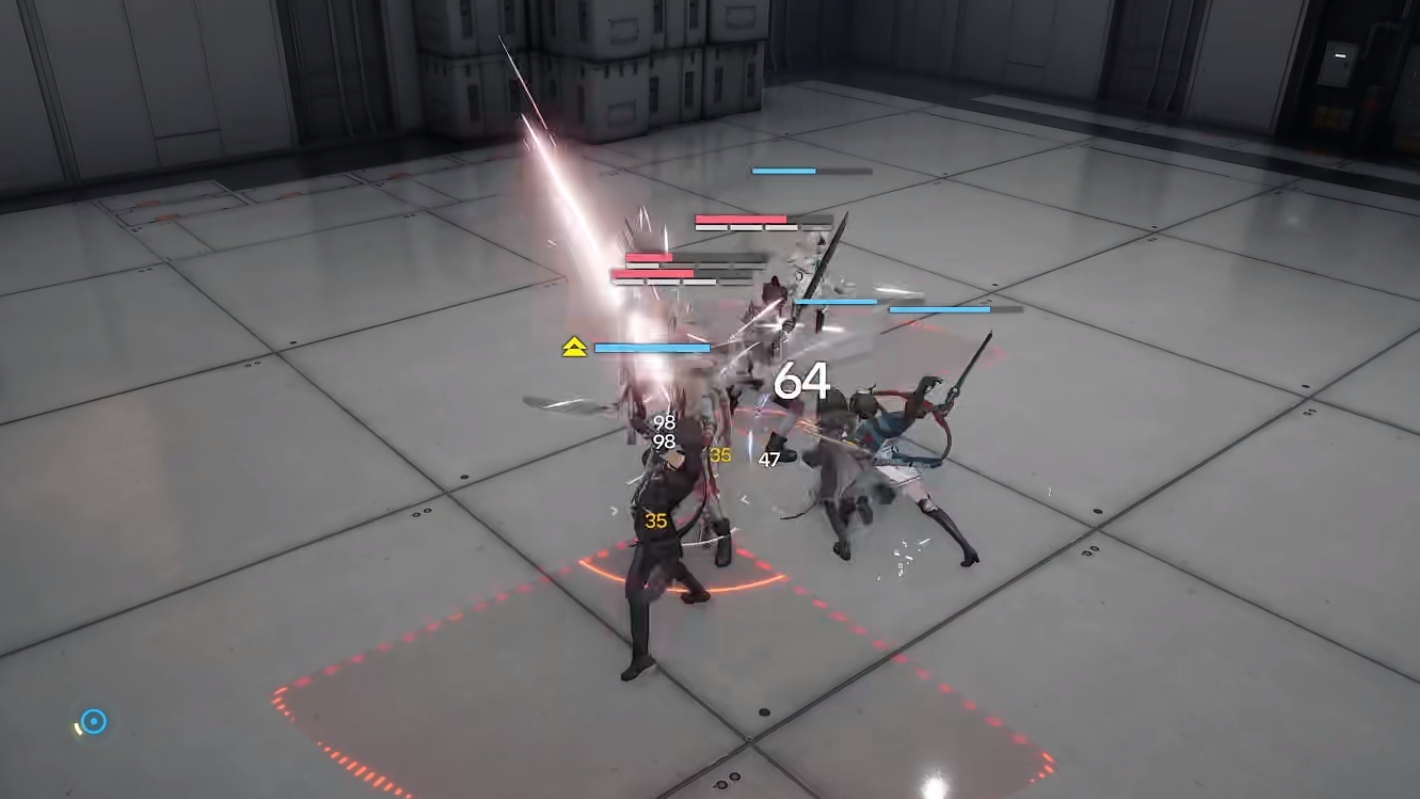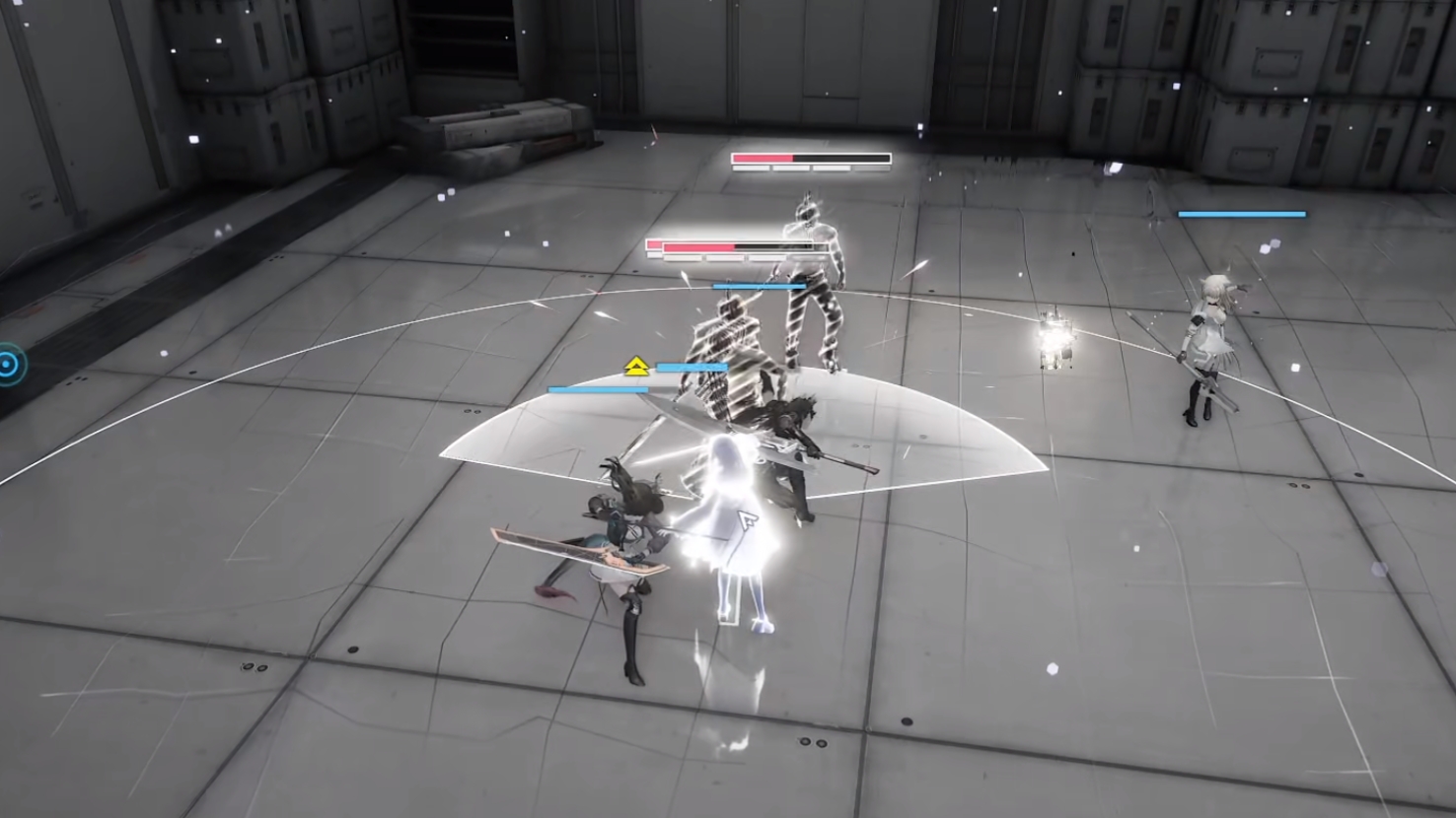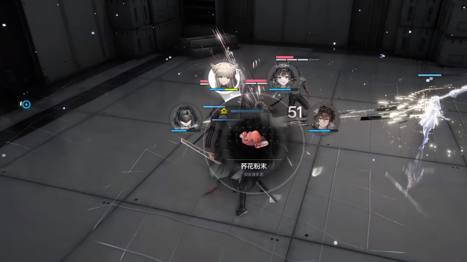 终末地中的战斗是以四人小队的形式进行的,玩家只能选择小队中的一名角色进行操控,但在切换角色后,可以控制队伍里的其他角色。而没被玩家控制的角色将会被AI接管,对距离自己最近的敌人发动攻击,这也使得游戏中很容易出现四名队友各打各的情况,不过玩家可以通过调整走位,让所有角色的攻击集中在一名敌人身上。