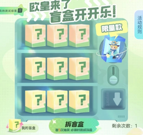 这个时装它还是专属限量款,除了答题获取时装以外,还能够通过开启盲盒来获取时装,抽盲盒次数可以根据活动页面的规则完成各种任务来获取,完成之后点击拆盲盒就有机会获取里面的高质量时装,总体来看这个活动还是非常有必要参与的,毕竟其中的id抢注和限量时装都对玩家很有用。