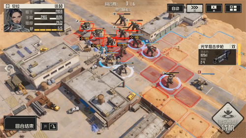 第二回合,赛文继续使用架枪技能,消灭左边的狙击手。波奇则移动到艾莉的旁边,使用修理技能,恢复艾莉的损坏部位。艾莉和卡尔则向右移动,接近敌方首领。