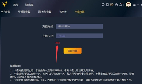 1.进入加速器首页,在界面中点击左侧会员充值(位置上图所示),进入充值页面后点击卡密/口令充值;