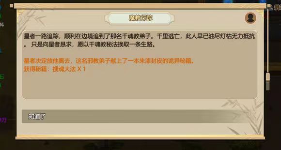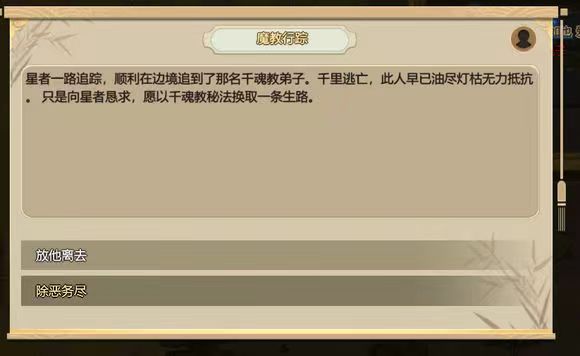 成功接收到仙剑令秘闻过后玩家们只需要简单安排一个弟子去完成就可以了,最后玩家们会触发第二个游戏秘闻,这个秘文叫做魔教行踪,魔教行踪持续时间是三天,而仙剑令的持续时间较长为两个月左右,所以玩家们要先提前了解一下这两个任务的时间,不要超过了,然后就是在做第二个任务的时候,游戏当中的NPC会给玩家们两个不一样的选项。