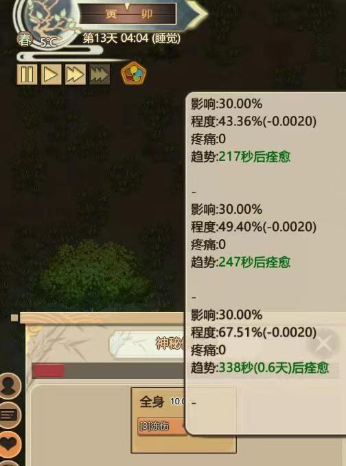 完成以上所说之后再来卡一下游戏当中神秘人苏醒的时间,在这里记得要保存好进度,然后去刷伤势,这里的刷伤是说的就是异种真气紫府,这样的话就能够有非常高的概率保持神秘人长期处于昏迷状态,对于任务的完成才会有力气许多。