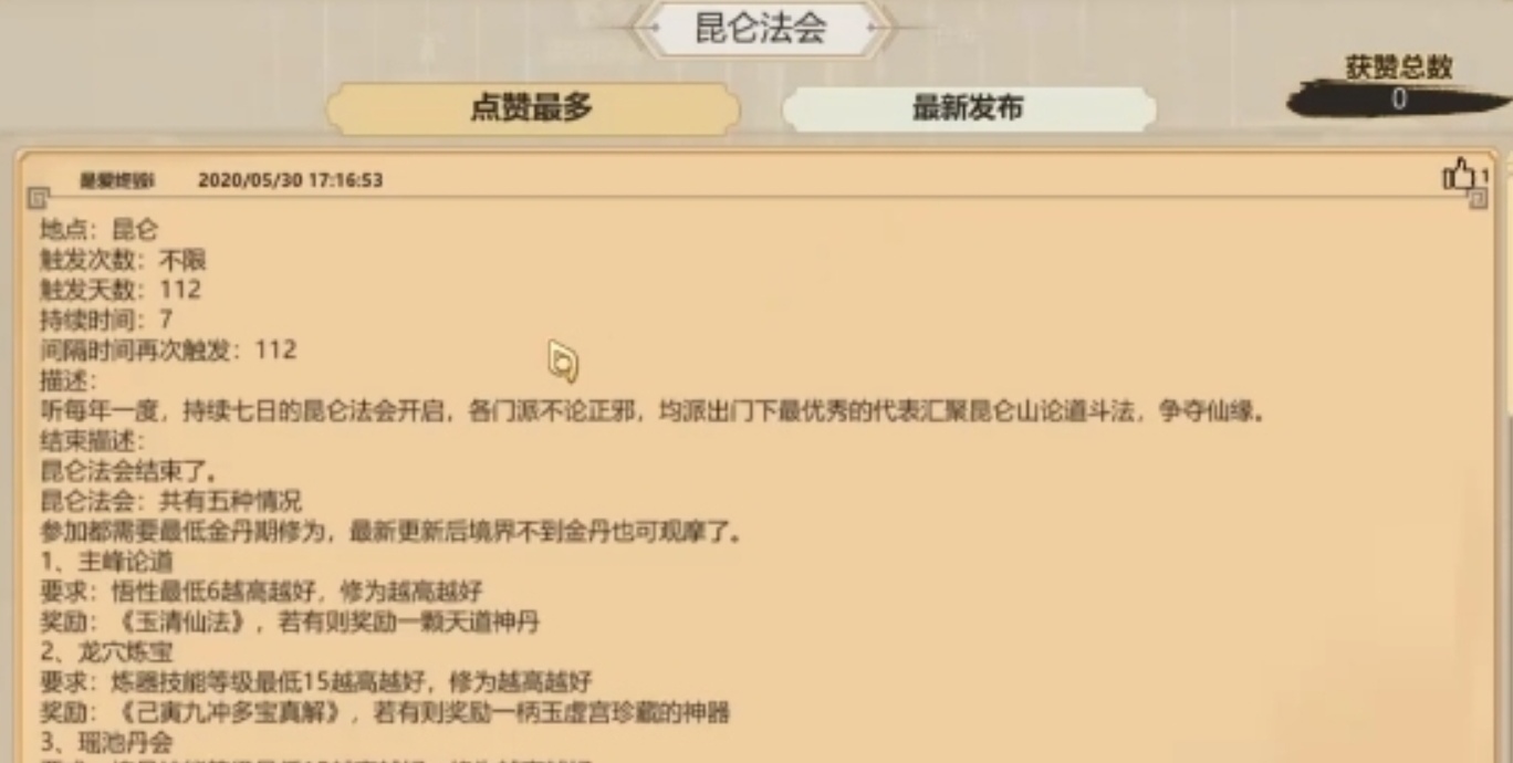 最后是仙剑令,地点在蜀山,触发次数只有1次,天数88天,可以持续时间58,蜀山如果收回仙剑令,十七名的余孽将会被收服,会给玩家重谢奖励。还有魔教行踪事件,地点发生在中原,触发次数1次,持续时间4天,只要玩家将魔教修炼者制服可以获得大量奖励。