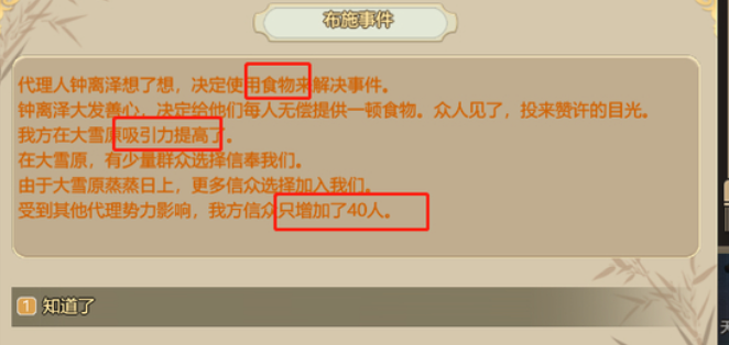 当然地区也会随机刷新相应的事件,向该事件中玩家需要解决这些因为逃难而流失的乞丐们。点击查看事件之后下方会显示出相应给予的东西,玩家选择好商应的物品,满足事件需求之后就可以获得信仰之力。事件完成之后玩家就会获得大量的信仰之力,也会让玩家本身的门派更加强大,这对选择修炼成神的玩家的重要性非常大。