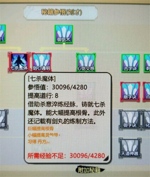 要想获得剑丸,首先需要习得七杀剑诀。七杀剑诀可以在开局时选择,也可以在游戏中通过参悟技能书或者其他途径获得。习得七杀剑诀后,需要修炼到结丹期,然后在技能树中学习左侧第二个技能“七杀魔体”。这个技能不仅可以大幅度提高角色的根骨,还可以解锁剑丸的丹方。有了丹方后,就可以在炼制丹药的选项中选择剑丸进行炼制了。炼制剑丸需要一定的炼丹技巧,如果失败了,可以多尝试几次,或者提高自己的炼丹能力。