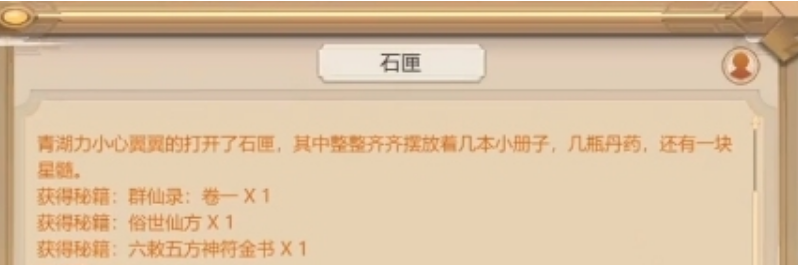 如果玩家成功拿到石匣,就可以打开石匣,看看里面有什么。石匣里面有两样东西,一样是一本功法,叫做天机化运法,是一门极其高级的运气类功法,可以让玩家的运气大增,遇到各种好事。另一样是一件法宝,叫做天通洞神符,是一件可以让玩家的神识穿透一切的法宝,可以让玩家的神识更加强大,探查各种秘密。