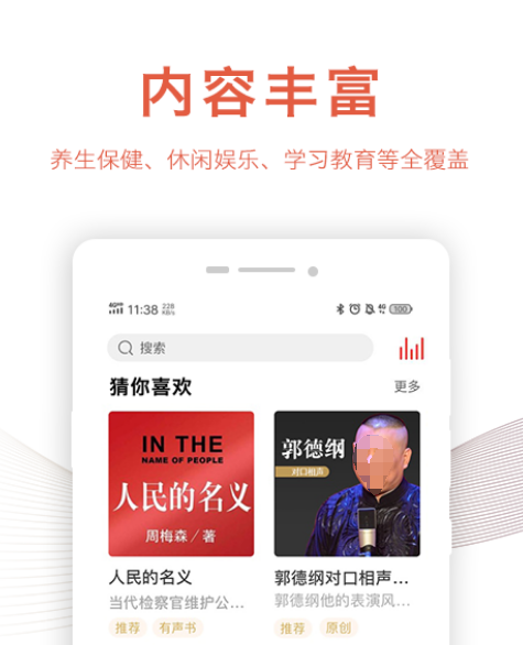 在这一个专门的听书软件当中,他不仅有很多的听书内容,而且也是专门为老年人打造的,因为老年人在生活当中业余生活并不是很多。如果经常看书的话,对眼睛又不是特别的好,软件专门为了老人听说而设立,里面有很多的听书产品,都是适合老年人的,既有养生保健内容,也有休闲娱乐内容、学习教育等等内容。