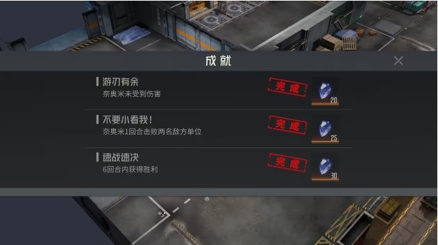后面的重返风暴之眼这个关卡其实也是一个难度不高的关卡,大家可以发现这个关卡的回合设置是不一样的,前四个回合需要大家操作奈奥米到达撤离点才算完成任务,而后面的四个回合就需要大家坚守在这个地点,三个成就也都是比较好完成的,己方全员存活的同时还可以在上面击败所有的敌人,而使用奈奥米的时候最少是要击败3名敌方单位的,这个成就可以说是这个关卡难度最高的地方,大家可以先用其他的机兵帮忙输出,最后由奈奥米来进行击杀就可以完成啦。