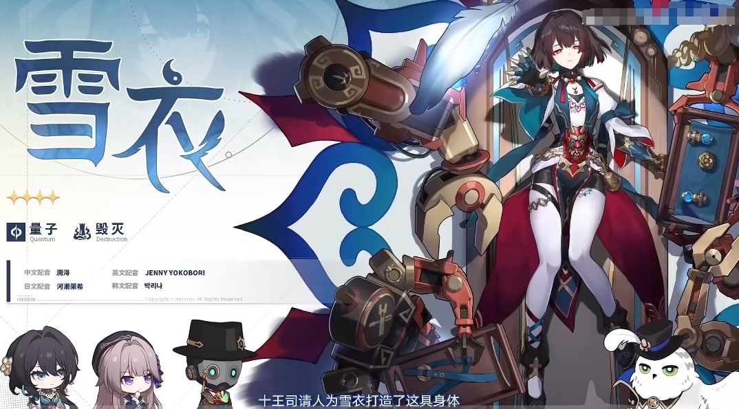 第二份喜角色是雪衣,这是一个四星级的女角色,在游戏中的身份定位其实是判官之一,在出场的时候其实一般手上都会拿着铁索,在剧情中其实也是一个比较冷情的角色,一般出现的时候都是战斗场面,也是一个猛女,伤害数值还可以,也有一定的控制。