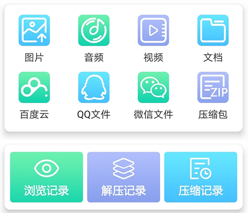 在这里它能让大家针对各类不同格式的文件进行处理,像图片、视频和音乐等等,都能一键进行压缩,此外软件还为大家提供了浏览记录以及解压记录的查询,方便用户去日常使用。
