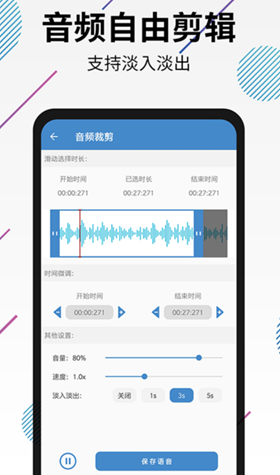 除了可以对声音片段进行裁剪和调整先后顺序之外,这款软件无疑是给我们提供了更多选择和功能。我们可以非常方便地设置播放时的速度和变声效果,而且还能够通过调整片段音量达到淡入淡出的效果。