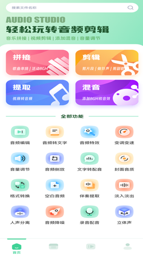 这款软件的界面还是相当直观的,软件将大家使用频率较高的音频抓取、混合等功能提取出来供用户快速选择完成,支持多种格式的文件导入和导出,实用性还不错。