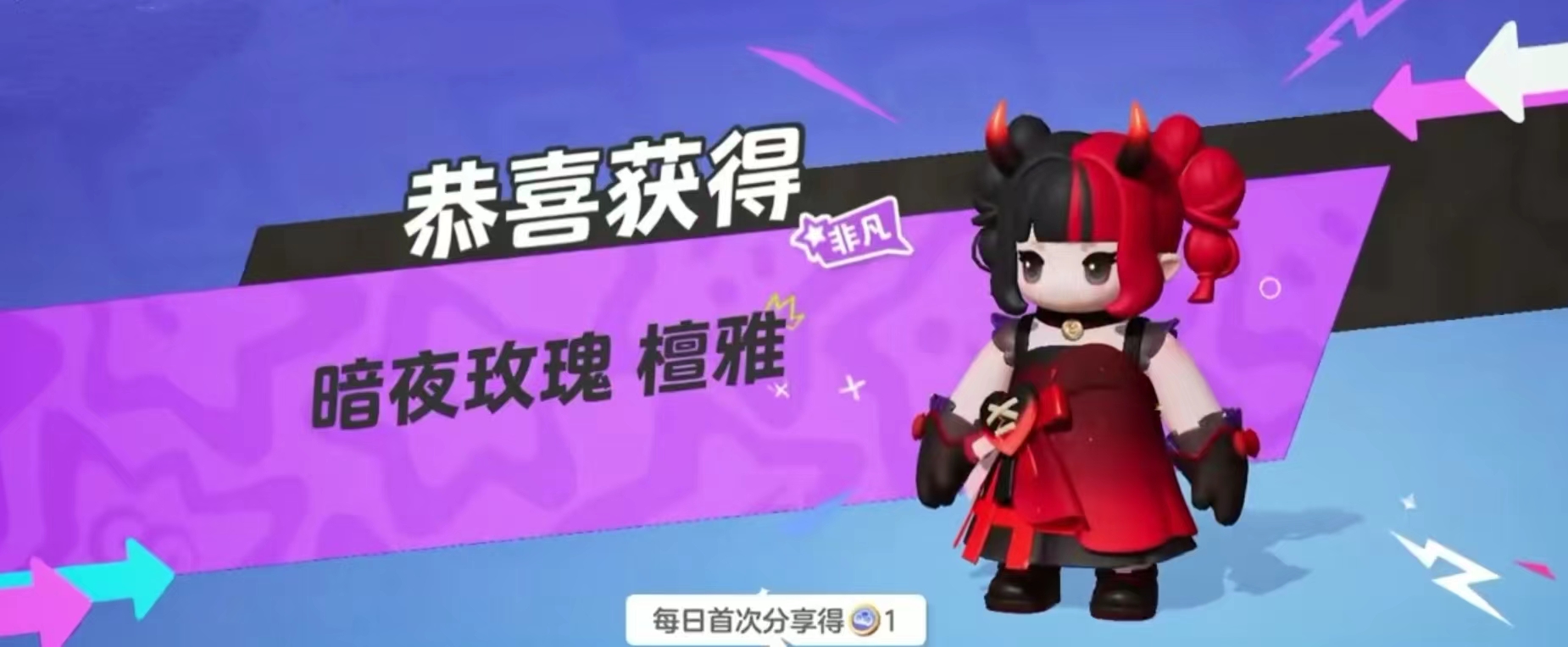 还有一个是混血玫瑰,发色是黑色加粉色,配色比较高级,然后小裙子也同样是黑粉色,在甜的同时,又带着一丝酷的意味,头上还有一对恶魔角,整个皮肤给人的感觉就是甜酷公主的样子。