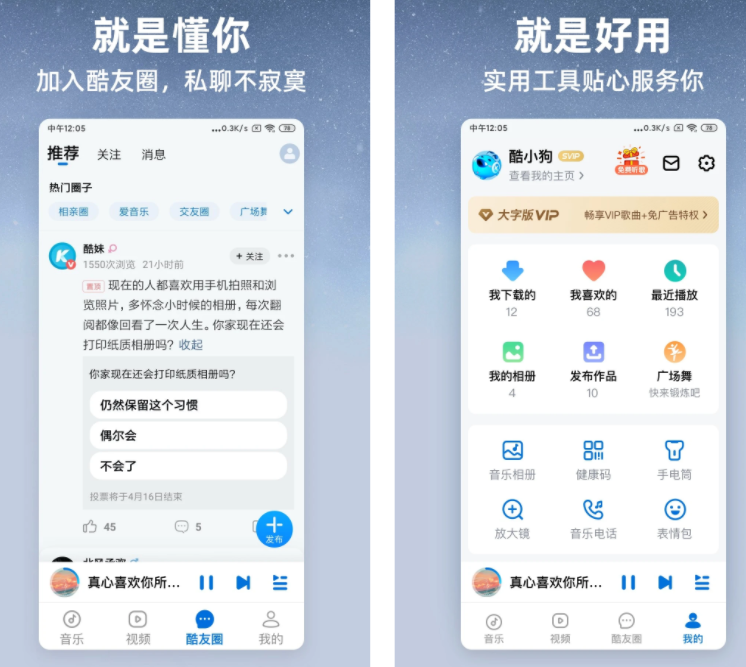 歌曲类型覆盖华语、小语种、古风、rap唱跳,还有专属5g专区,营造不同场景,适合跑步、学习、聚会等的音乐氛围,还能自定义制作音乐铃声,满足你日常听歌需求。
