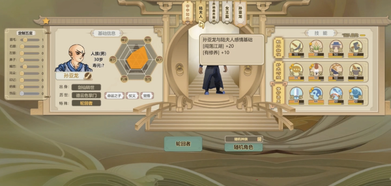 然后为大家推荐的轮回者是孙亚龙。这个角色修炼的主要功法是木属性功法。然后建设属性很高,很适合用来建房子。最重要的一点是这个角色开局是自带材料的,这些材料可以让玩家在最短时间内建好房子,享受风水加成。