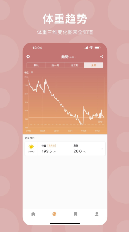 对于需要减肥的伙伴来讲这是一夸超级好用的应用软件,可以通过它来记录不同时段的体重情况,利用多维度的分析方式进行总结和对比。