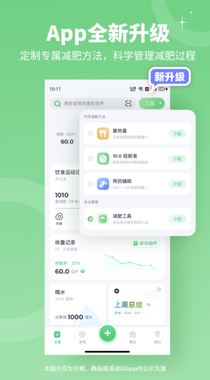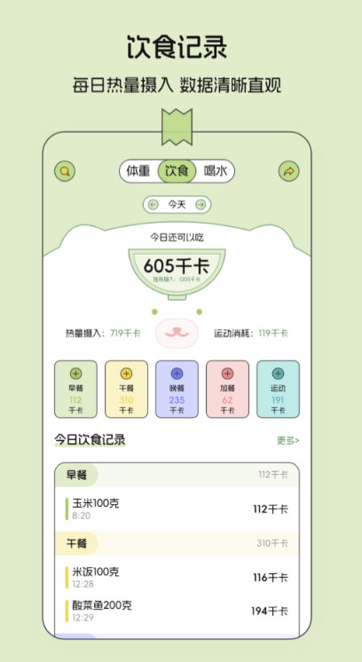 有了它之后就有一个专属的小管家来监督大家的减肥任务了,将自己的体重输入到软件里边,然后每天的饮食,饮水都会有不同的提示和建议,从而让大家拥有健康的生活。