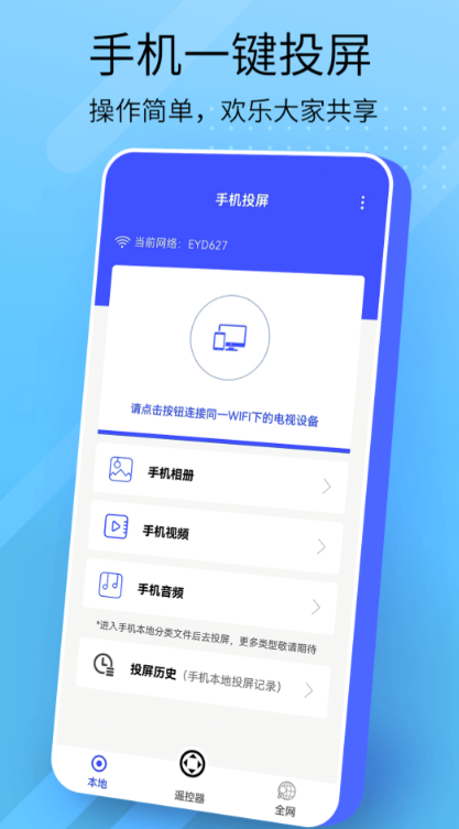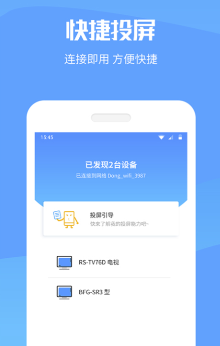 这是一款智能的手机投屏应用软件,可以让手机跟任何的智能电视所连接,直接就可以将喜欢的内容投放到设备上播放,连接不需要过多的等待。