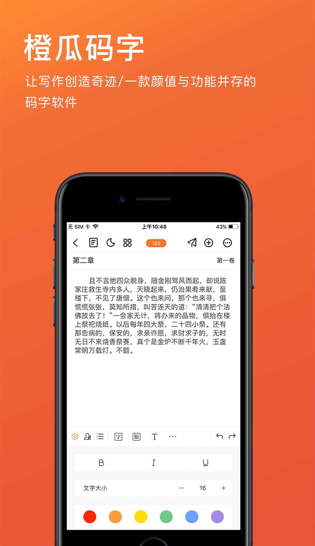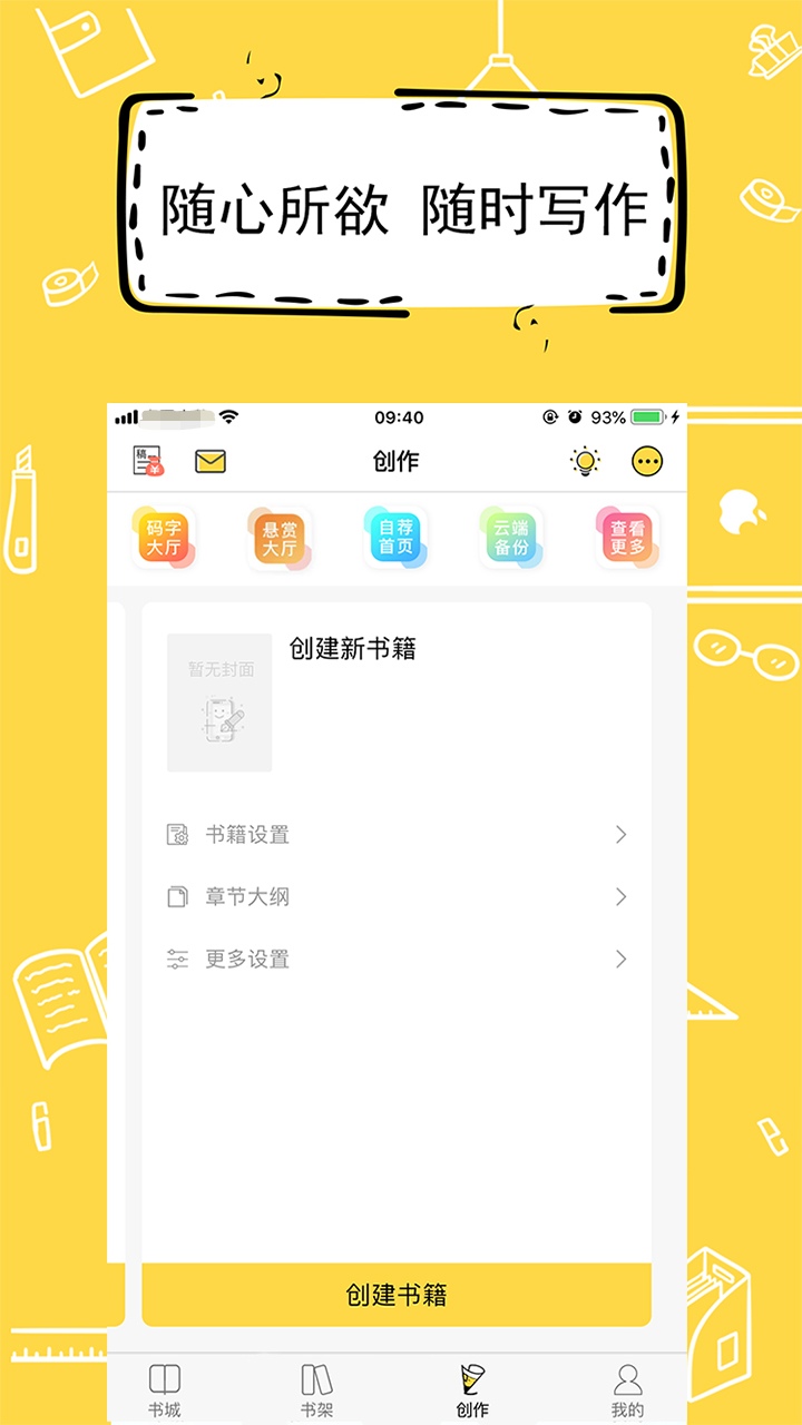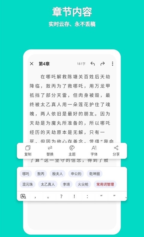 创作写作就用写小说APP,支持离线使用,备份到云端数据就永远不会丢失,发布书城让更多的人看到这样你也可以赚取收益,APP会对书写内容进行自动排版。