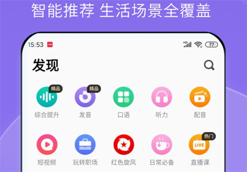 作为一款配音学习外语类软件,它的整体功能上还是非常突出的,同时能让大家去通过课程的方式来快速的学习与掌握,多种不同的语种全面覆盖,更是有着素材视频提供给大家,包括自动生成全新的表演视频以及把喜欢的作品转发等。